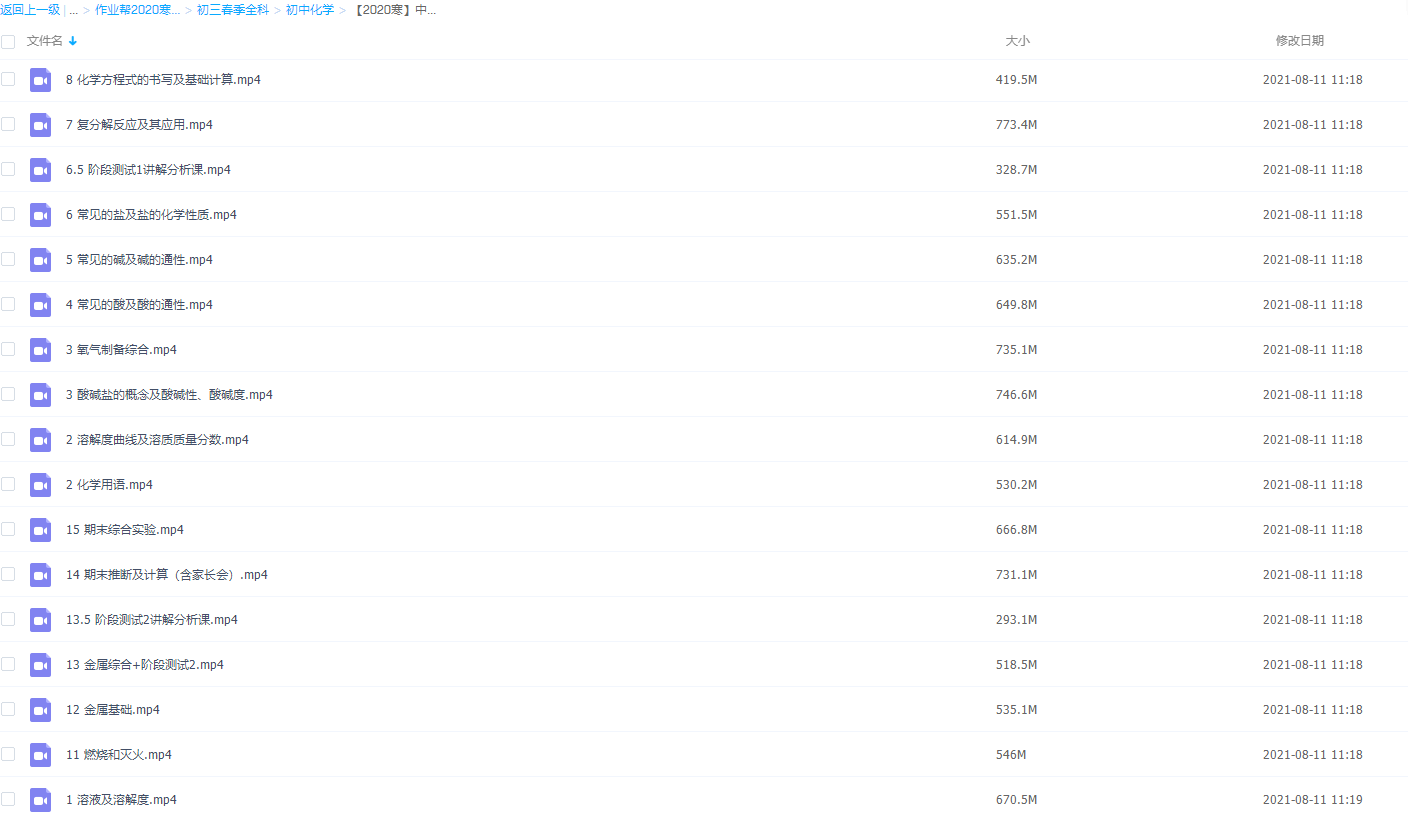 此课件来自作业帮网校,【2020寒】中考化学冲顶班(杨静然),包含视频课程和讲义资料。此课件知识点包括:化学方程式的书写及基础计算、复分解反应及其应用、常见的盐及盐的化学性质、酸碱盐的概念及酸碱性、酸碱度等视频