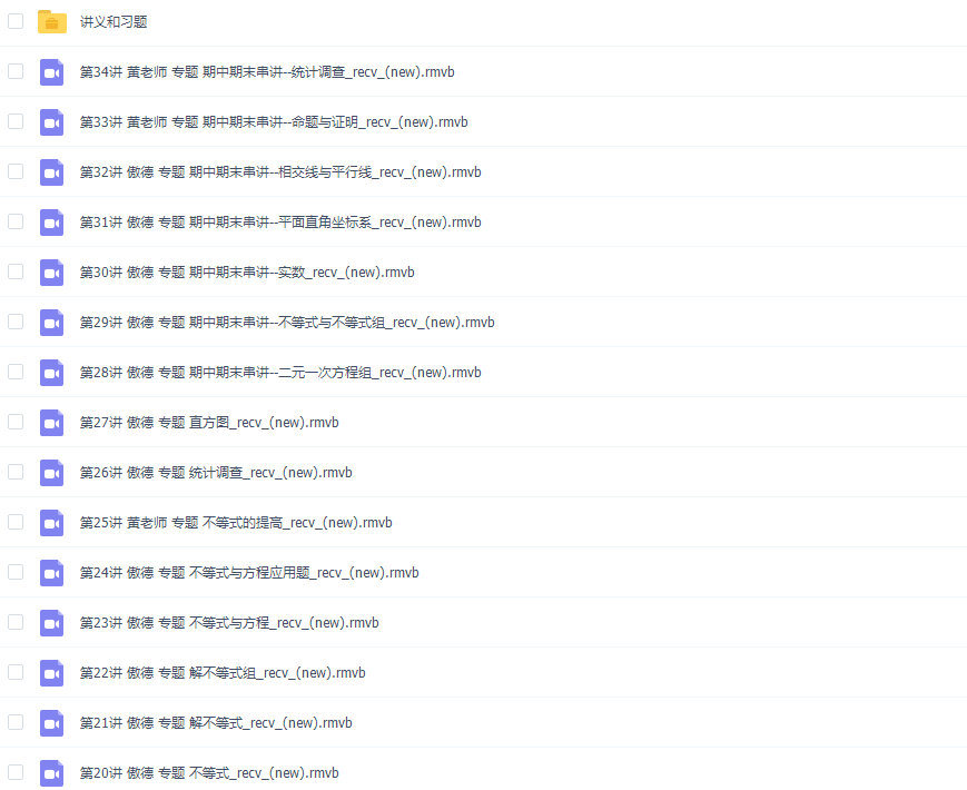 此课件来自傲德初一数学满分冲刺下学期高清视频课程,此课件主要知识点包括:相交的线、平行线及判定、平行线的性质和平移、命题与证明、命题与证明、平行中的计算、平行线中的证明、平方根与算数平方根、立方根与实数、实数性质相关计算、实数与数轴、平面直角坐标系。。。。