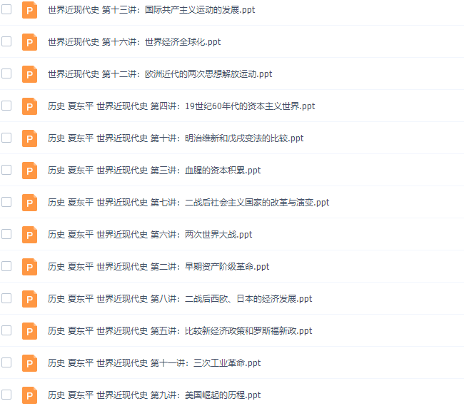此课件来自学科网世界近现代史专题课程高清视频,此课件主要知识点包括:早期资产阶级革命、血腥的资本积累、19世纪60年代的资本主义世界、比较新经济政策和罗斯福新政、两次世界大战、二战后社会主义国家的改革与演变、二战后西欧、日本的经济发展、美国崛起的历程、明治维新和戊戌变法、三次工业革命、欧洲近代的两次思想解放运动、国际共产主义运动的发展、殖民地半殖民地人民争取主权的的斗争、二十世纪国际格局的变化、世界经济全球化。。。