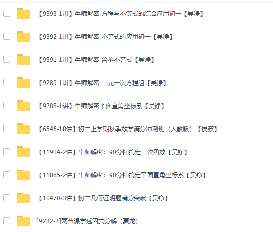 此课件来自学而思网校,吴铮解密初中数学专题课程合集。此课件主要知识点包括:因式分解、几何证明题满分突破、解密平面直角坐标系、二元一次方程组、含参不等式、不等式的应用、方程与不等式的综合应用。