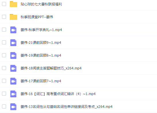 此课件来自猿辅导网校,姜伟高三英语2021秋季A+班课程完结,包含视频课程和讲义资料。此课件主要知识点包括:秋季开学典礼、虚拟语气、定语从句、定语从句进阶、阅读细节题解题技巧、名词性从句、阅读主旨题解题技巧等视频。