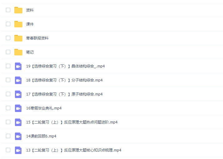 此课件来自猿辅导网校,廖耀华高三化学2022年寒假A+班网课高清视频。此课件主要知识点包括:化学实验基础、实验选择题与定量型实验、实验流程综合分析、实验方案的设计与评价、无机与有机实验综合、反应原理大题核心知识点梳理、反应原理大题热点问题进阶、原子结构综合、分子结构综合、晶体结构综合等等视频课程。。。。