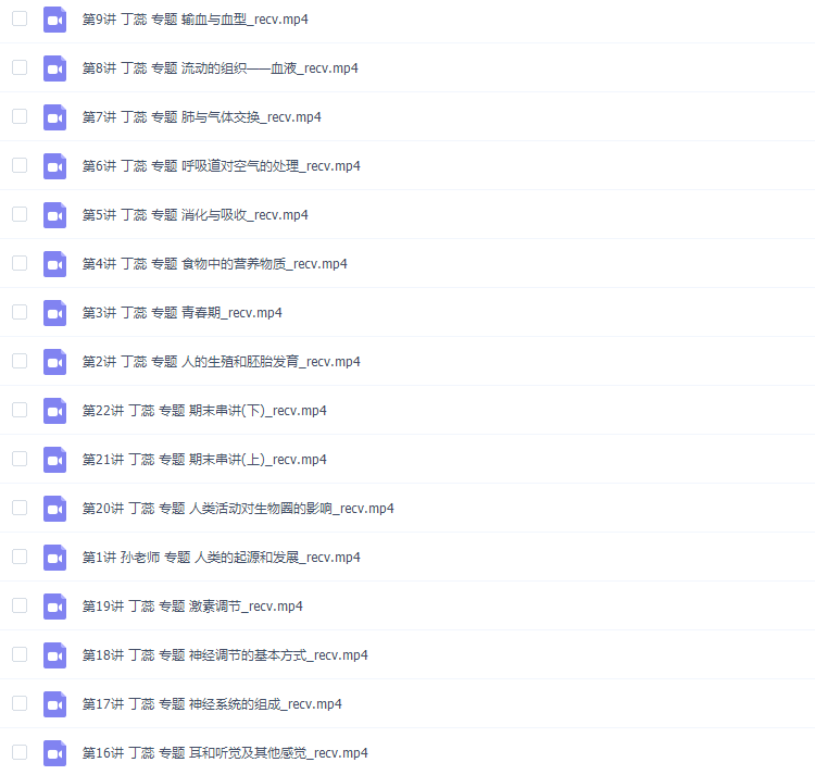 此课件来自简单学习网,丁蕊初一生物下学期视频课程完结。此课件主要知识点包括:输血与血型、流动的组织——血液、肺与气体交换、呼吸道对空气的处理、消化与吸收、食物中的营养物质、青春期、 人的生殖和胚胎发育、人类活动对生物圈的影响、人类的起源和发展等等视频课程。。。