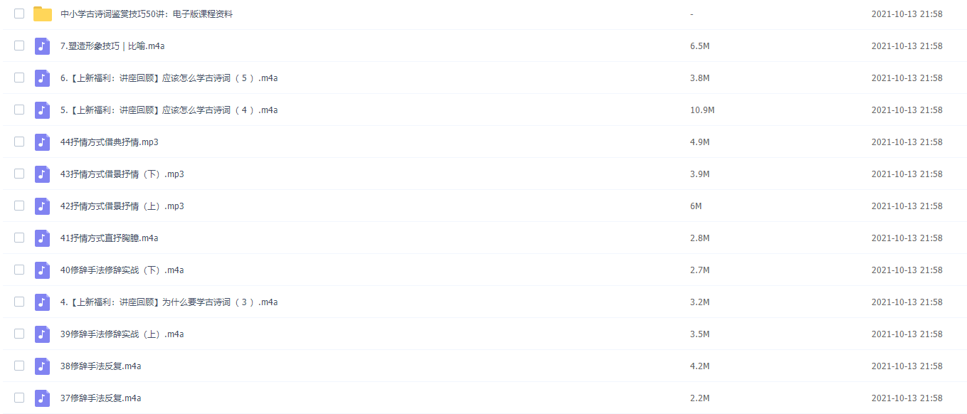此课件来自邵鑫中小学古诗词鉴赏技巧完结,此课件主要包括:鉴赏8大高频考点、42个鉴赏技巧。并大量运用古今诗词、歌词的对比举例,帮助你更好地理解、掌握、运用这些技巧。通过课程学习,对古诗词、文言文理解更加深刻、准确。学习诗词鉴赏技巧,不仅对诗词学习有帮助,对阅读、写作的帮助也很大。